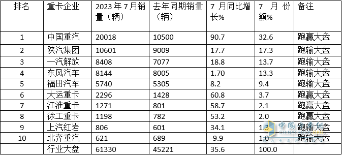 總體看, 2023年7月重卡行業(yè)銷售61330輛 , 同比增長35.6%;重汽奪冠、陜汽及解放分別居第二和第三。