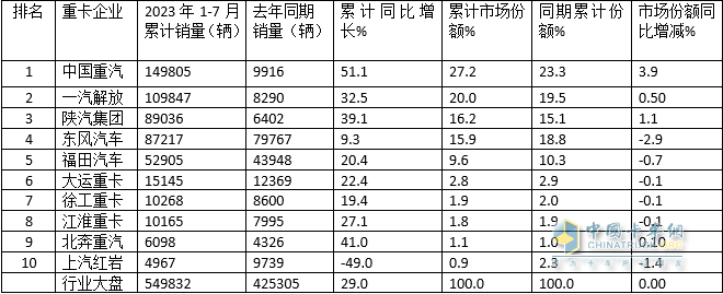 從2023年1-7月車企累計銷量表現(xiàn)看,中國重汽、一汽解放、陜汽居前三;TOP10累計同比9增1降,重汽領(lǐng)漲。