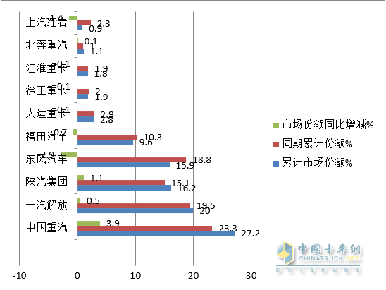 特點四:重汽奪冠,陜汽、解放分列二、三;TOP10同比9增1降,重汽領(lǐng)漲