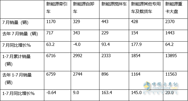 表1,2023年7月及1-7月新能源重卡各細分市場銷量及同比(數(shù)據(jù)來源:終端上牌信息)