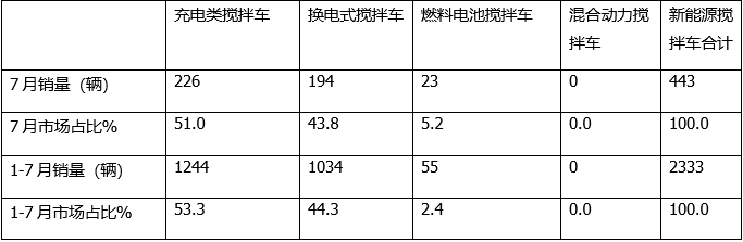 上圖表可見,按技術路線及補電方式劃分,在今年7月及1-7月新能源攪拌車銷量結構中: