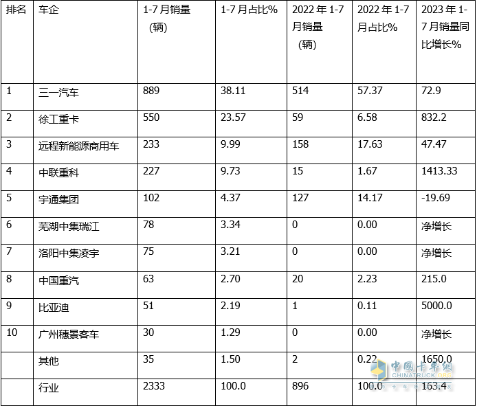 上圖表顯示,在2023年1-7月新能源攪拌車銷量中: