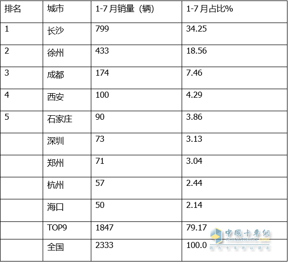 表5、根據(jù)終端上牌數(shù)據(jù),2023年1-7月新能源攪拌車流向TOP9城市(只統(tǒng)計銷量在50輛以上城市):
