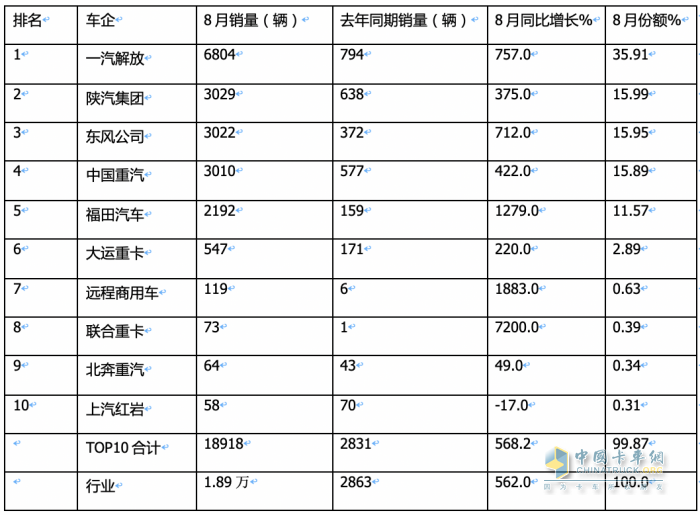 2023年8月燃?xì)庵乜ńK端市場特點(diǎn):暴漲5.62倍銷量創(chuàng)新高,解放強(qiáng)勢奪冠 陜汽、東風(fēng)、重汽爭第二