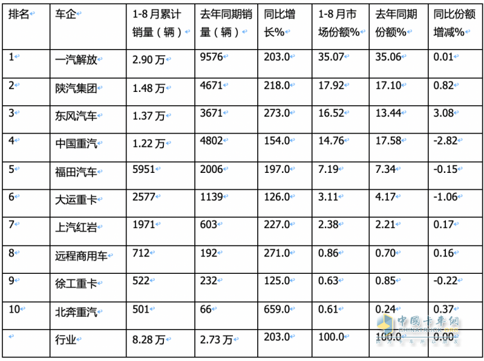 截圖1,2023年1-8月燃?xì)庵乜ㄤN量(數(shù)據(jù)來源:公開上牌信息)2023年8月燃?xì)庵乜ńK端市場特點(diǎn):暴漲5.62倍銷量創(chuàng)新高,解放強(qiáng)勢奪冠 陜汽、東風(fēng)、重汽爭第二