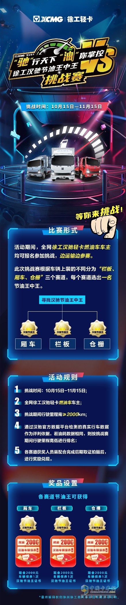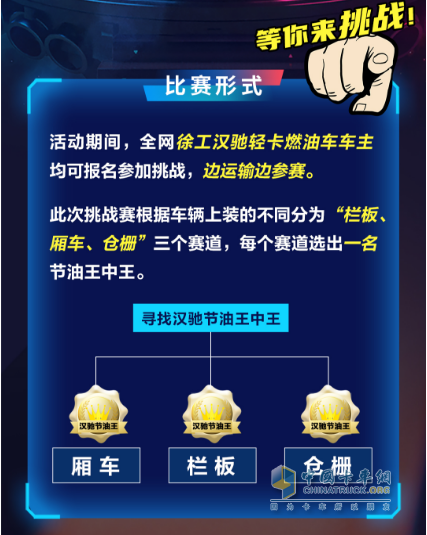 本次徐工輕卡尋找徐工漢馳節(jié)油王中王挑戰(zhàn)賽是面向全體徐工輕卡燃油車用戶展開,在“欄板、廂車、倉柵”三個賽道中,全國的漢馳車主或駕駛員均可報名、一較高低,展開油耗排名比拼,通過漢馳官方數(shù)據(jù)平臺檢測的真實行車數(shù)據(jù)作為評判依據(jù),若油耗數(shù)據(jù)相同,則按挑戰(zhàn)賽期間行駛里程高低進行排名,評選出各組節(jié)油王!