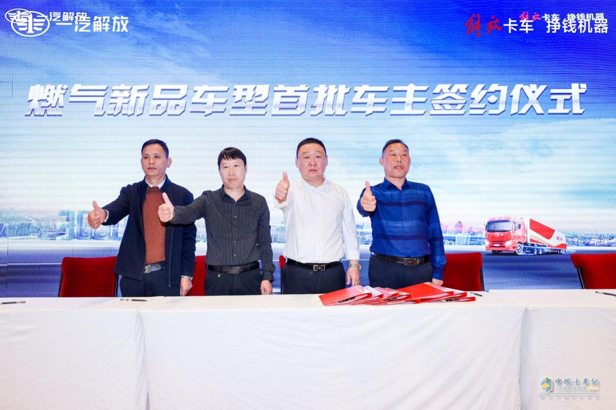 發(fā)布會上,青汽解放代表、當(dāng)?shù)卣?、洛陽天裕代表、首位車主共同完成JH6燃?xì)庑缕泛幽下尻柕纳鲜袃x式,鼓勵河南地區(qū)廣大經(jīng)銷商和用戶啟程新未來,攜手再創(chuàng)新輝煌。