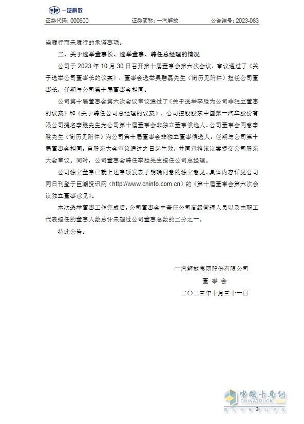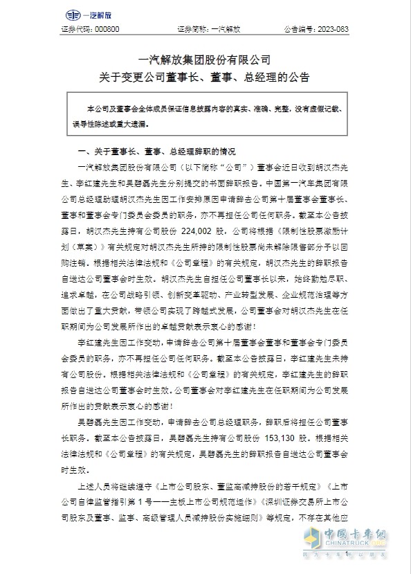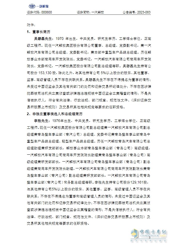 以下為一汽解放集團股份有限公司關(guān)于變更公司董事長、董事、總經(jīng)理的公告全文: