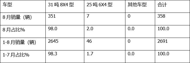 特點(diǎn)五:無(wú)論是8月還是1-8月,主銷車型均是31噸8X4型的新能源攪拌車