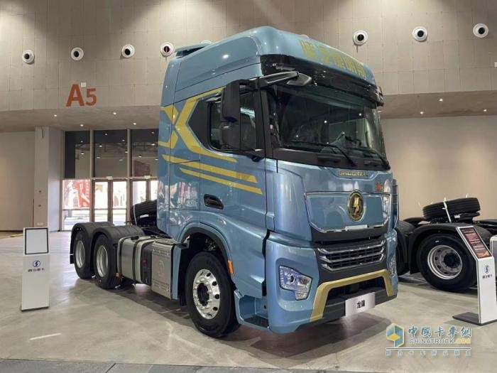 接下來兩款特色產(chǎn)品和濰柴關(guān)聯(lián)同樣不小。上面這一款X6000采用濰柴WP14DI 最大580馬力;本車是一款缸內(nèi)直噴燃?xì)廛囆?,?dòng)力性和同馬力柴油相同,比燃?xì)獍l(fā)動(dòng)機(jī)功率和扭矩提高20%;另外,它可以用5%柴油引燃+95%天然氣燃燒做功,保障動(dòng)力同時(shí)采用多個(gè)黑科技,實(shí)現(xiàn)節(jié)氣15%,超低氣耗引領(lǐng)行業(yè)。另外一款是X5000S菁英版 6×4甲醇牽引車,可匹配濰柴13L甲醇發(fā)動(dòng)機(jī);一方面其經(jīng)濟(jì)環(huán)保,相同工況下甲醇牽引車較油車節(jié)省18-32%,每公里最多省1元,年收益增加15%;另一方面,整車甲醇容積最大1150L,續(xù)航超過1100KM,續(xù)航里程行業(yè)最長;還有就是,它采用了輕量化設(shè)計(jì),自重低至8.4噸。