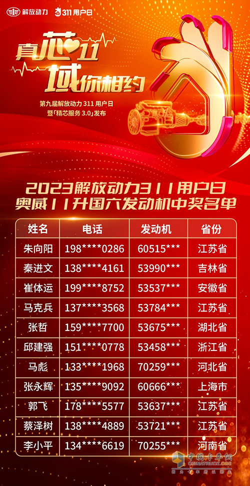 抽取11臺11升奧威發(fā)動機(jī),是歷屆311用戶日中的重要環(huán)節(jié),今年解放動力首次邀請11位意見領(lǐng)袖用戶,攜手他們將可提供個性化定制并實現(xiàn)精準(zhǔn)節(jié)油的解放動力國六明星產(chǎn)品贈出,將“成就卡友一路OK”的品牌心愿化作用戶前行的動力。