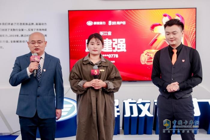 一汽解放客戶關(guān)系主任管理師朱江濤(左)抽取發(fā)動機(jī)大獎