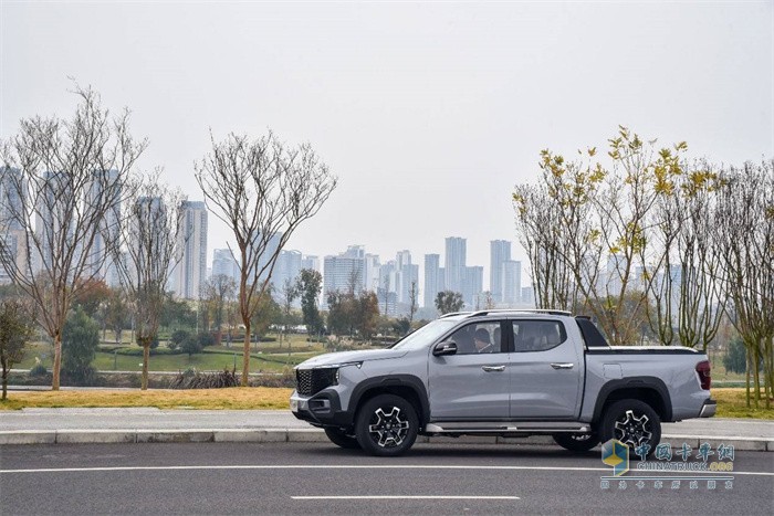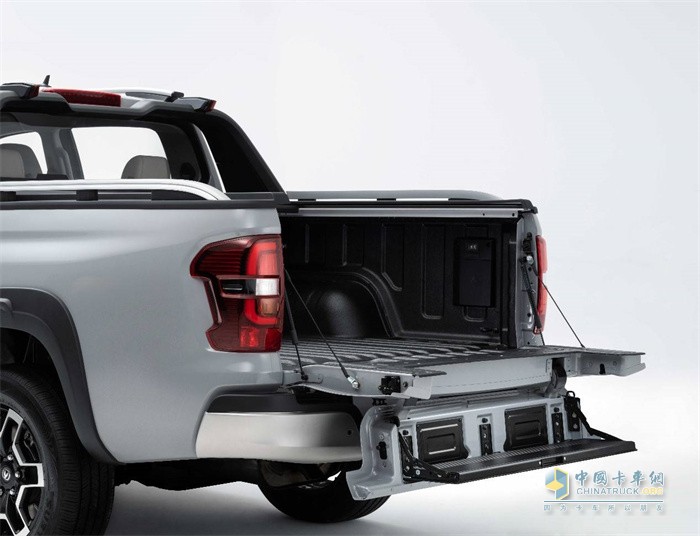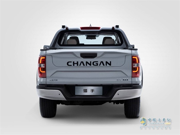 車身尾部,新車尾部采用了十分符合皮卡車型的設(shè)計風(fēng)格,兩側(cè)的尾燈呈縱向分布,尾門中央印有顯眼的品牌英文LOGO,后包圍設(shè)計則與前包圍相呼應(yīng)。此外,新車還提供了全新的機(jī)甲灰車色,并根據(jù)車型配置提供不同的防滾架、輪圈、輪眉、貨箱蓋、貨箱尾門等可選。