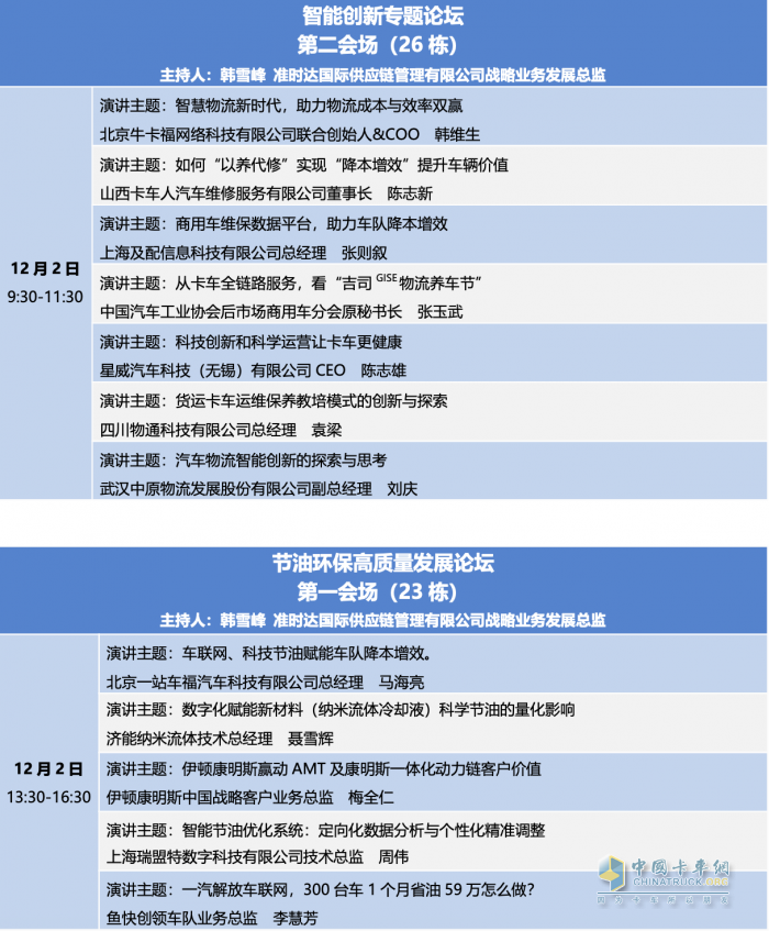 作為貨運物流行業(yè)的權威展會,吉司GISE養(yǎng)車節(jié)將在后續(xù)兩天的活動里,繼續(xù)帶來“智能創(chuàng)新專題”、”節(jié)油環(huán)保高質量發(fā)展“、“互聯(lián)網、智能化、數(shù)字化在商用車后市場的應用”、“保險及安全實踐分享“四大主題論壇,超30位代表物流、新能源、卡車后市場、節(jié)油環(huán)保等相關領域知名專家、頭部企業(yè)等嘉賓帶來最前沿的精彩演講及分享,圍繞智慧物流新時代、降本增效、汽車物流智能創(chuàng)新的探索與思考等最熱門核心話題,讓物流企業(yè)及個人一次性掌握年度一線的專家觀點及未來發(fā)展新趨勢。