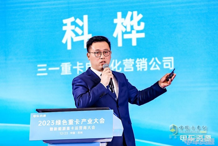 三一重卡電動(dòng)化營(yíng)銷(xiāo)公司總經(jīng)理科樺發(fā)表了《綠色物流,行則必達(dá)》的主題演講,他指出,新能源重卡高速增長(zhǎng),滲透率不斷提升,已經(jīng)從局部試點(diǎn)向“遍地開(kāi)花”發(fā)展,新能源重卡運(yùn)輸里程局限于100公里之內(nèi)。