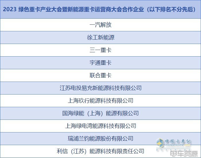 本次大會(huì)引起了行業(yè)高度關(guān)注,并得到相關(guān)企業(yè)的鼎力支持。2023綠色重卡產(chǎn)業(yè)大會(huì)暨新能源重卡運(yùn)營(yíng)商大會(huì)組委會(huì)與多家企業(yè)合作,共同助力行業(yè)盛會(huì)的開(kāi)啟。合作企業(yè)排名不分先后: