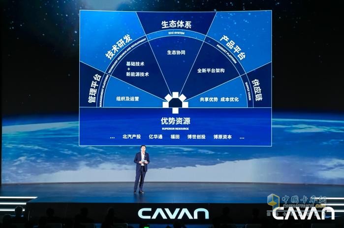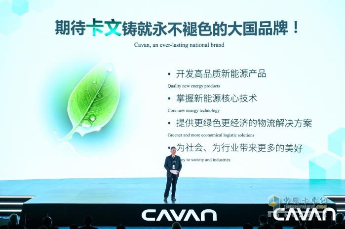 發(fā)布會上,卡文汽車的品牌標識也正式亮相。其中,圖形標識的創(chuàng)意來源于自然中的樹葉,當陽光透過葉脈,“卡”字與葉脈重合在一起,寓意卡文汲取自然能量,并通過新能源技術(shù)及科技生態(tài)的轉(zhuǎn)化,賦能行業(yè)低碳可持續(xù)發(fā)展。英文標識“CAVAN”,承載著卡文的使命。首字母C代表Carbon,體現(xiàn)對低碳時代發(fā)展的堅定承諾;尾字母 N代表New Energy和Nature,用新能源科技創(chuàng)新推動綠色交通與自然和諧共生,為地球的可持續(xù)發(fā)展不懈努力。AVA是卡文團隊的“3A”精神——新能源技術(shù) Advanced、設(shè)計理念 Advanced、質(zhì)量品質(zhì) Advanced的象征??ㄎ钠囈?ldquo;三個一流”標準重新定義商用車領(lǐng)域,專注于新能源技術(shù)領(lǐng)先,專注于用戶價值創(chuàng)造,專注于可持續(xù)發(fā)展的美好未來。秦志東介紹,在全新技術(shù)與服務(wù)創(chuàng)新的加持下,卡文汽車將不僅是物流企業(yè)和司機的“省心省力”的賺錢工具,更是智慧城市、綠色交通和全球能源轉(zhuǎn)型的智慧能源載體。