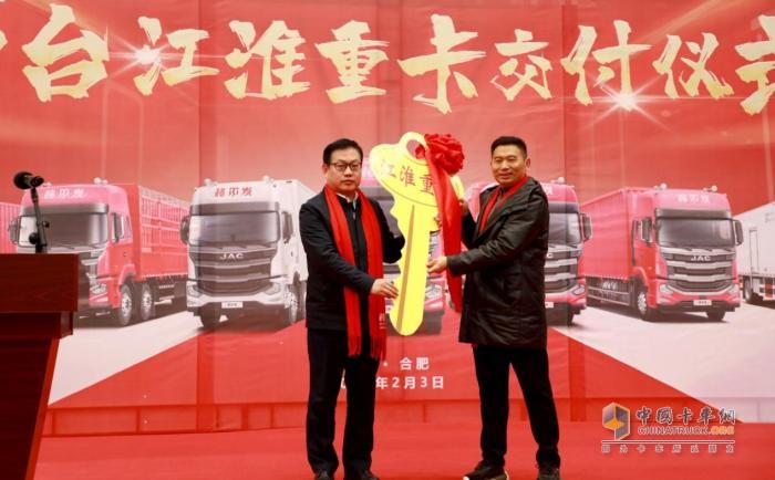 江汽集團股份公司總經(jīng)理李明出席儀式,并交付象征攜手共進的金鑰匙。重型商用車公司副總經(jīng)理(主持工作)王守勝致辭,重型商用車營銷公司安徽銷售公司副總經(jīng)理王永紅主持會議。
