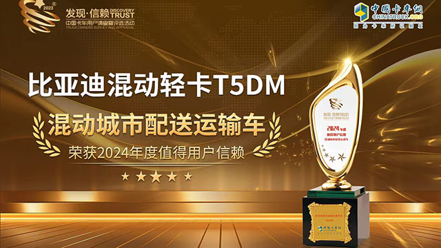 恭喜比亞迪混動(dòng)輕卡T5DM榮獲2024年度值得用戶(hù)信賴(lài)混動(dòng)城市配送運(yùn)輸車(chē)!