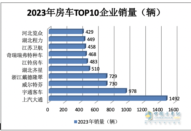 2023年全年,上汽大通奪得房車行業(yè)冠軍,累計(jì)銷量為1492輛,也是唯一銷量超過(guò)1000輛的車企,同比下降7%,市場(chǎng)占比10.39%;居于第一;宇通客車?yán)塾?jì)銷售978輛,同比下降11.4%,市場(chǎng)占比6.81%,居第二;排名第3名及以后企業(yè)銷量均在800輛以下;top10同比7增3降,其中湖北威爾特芬同比增長(zhǎng)236.2%領(lǐng)漲TOP10。