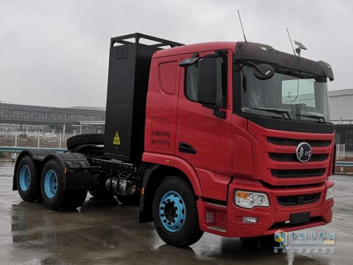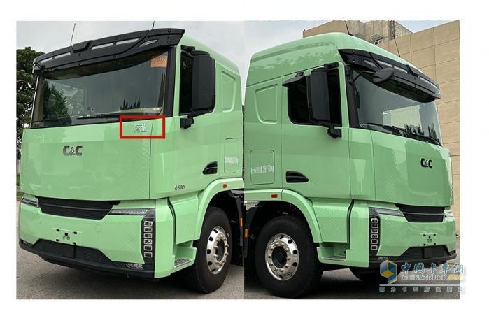 駕駛室整體顏色為青色。整車后橋大概率為配有兩個驅(qū)動電機的電驅(qū)橋,電機品牌為法士特,電池為寧德時代LFP。