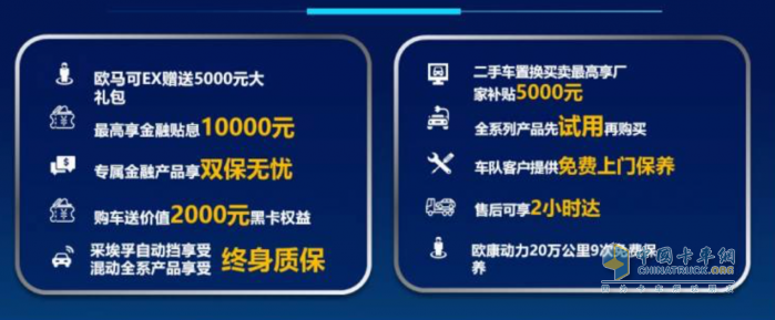 在輕卡方面,奧鈴新能源智藍(lán)EM,這款新能源小卡圍繞核心三電系統(tǒng)進(jìn)行了全面升級(jí),被譽(yù)為T(mén)CO最佳輕卡。更令人欣喜的是,現(xiàn)場(chǎng)購(gòu)車(chē)即可享受交1000元抵3888元購(gòu)車(chē)禮品及超長(zhǎng)質(zhì)保等優(yōu)惠。另外時(shí)代領(lǐng)航大G擁有豐富的產(chǎn)品配置,包含6MT/8MT/AMT產(chǎn)品可供選擇,其智能配置遙遙領(lǐng)先,包含行業(yè)首配雙聯(lián)屏、360環(huán)視系統(tǒng)、一鍵啟動(dòng)+無(wú)鑰匙進(jìn)入等配置。