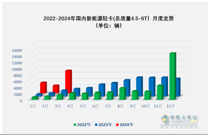 ---代表著2024年3月新能源輕卡銷量的紅色柱體比之前的2023年、2022年同期都要高,也就是說2024年3月新能源輕卡銷量7065輛創(chuàng)近3年同期新高,因2022年之前的3月新能源輕卡銷量都較低,因此可以認為,今年3月新能源輕卡銷量創(chuàng)下史上同期新高!