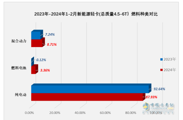 截圖2,2024年1-2月各技術路線的新能源輕卡銷量占比(數(shù)據(jù)來源:公開的終端上牌信息)
