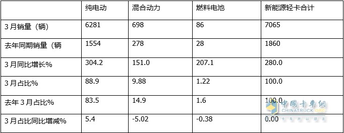 上表顯示,在2024年3月能源輕卡各技術路線車型銷量同比、占比及占比同比增減看: