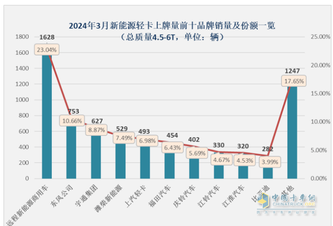 截圖4,2024年3月新能源輕卡銷量TOP10企業(yè)銷量及占比(數(shù)據(jù)來源:公開的終端上牌信息)