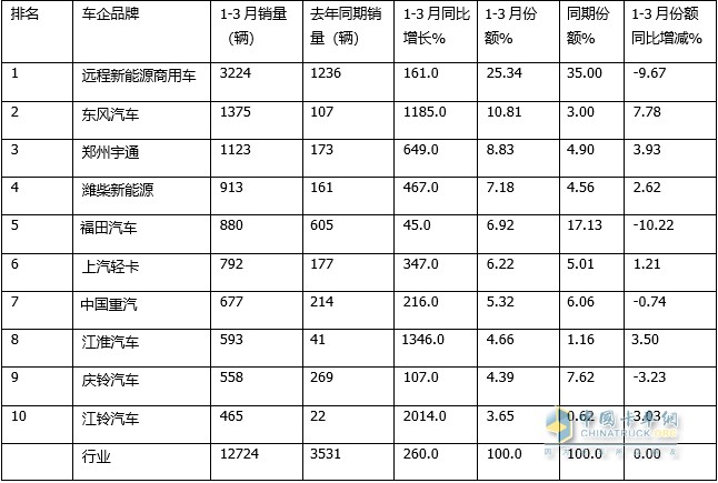 ---遠程新能源商用車銷售3224輛,同比大增161%,也是唯一銷量超過3000輛的車企,強勢霸榜;市場占比為25.34%,占比同比減少9.67個百分點,是占比同比減少最多的車企;說明遠程的霸主地位正在競爭對手削弱!