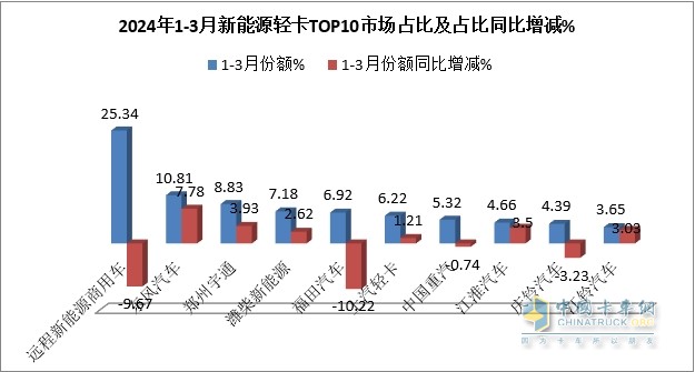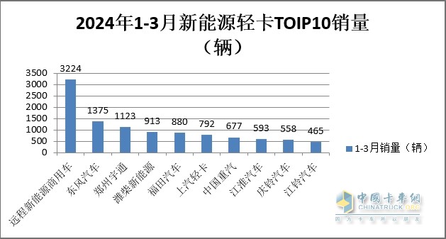 上圖表顯示:在2024年1-3月新能源輕卡累計銷量TOP10中: