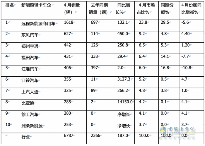 4月新能源輕卡:銷6787輛增187%創(chuàng)新高! 遠(yuǎn)程\東風(fēng)\宇通居前三 比亞迪領(lǐng)漲