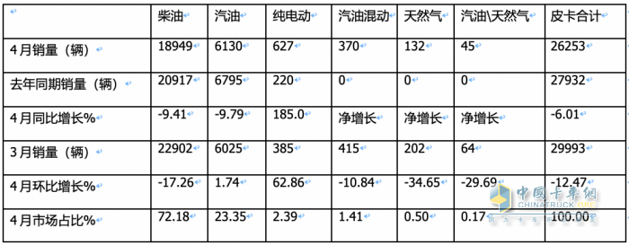 上圖表顯示,2024年4月各類動(dòng)力皮卡銷量同環(huán)比及占比: