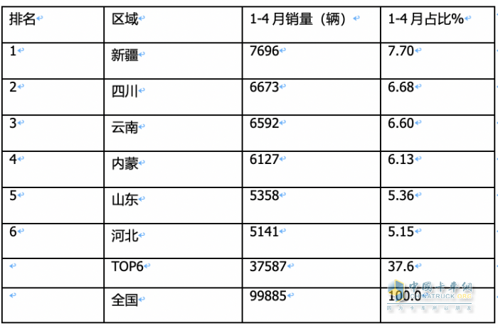 TOP6?。ㄗ灾螀^(qū))累計(jì)銷量達(dá)到37587輛。累計(jì)占比近4成(37.6%),可見今年1-4月國內(nèi)皮卡市場分布不均衡。