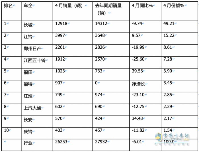 上圖表可見,從2024年4月國內(nèi)皮卡生產(chǎn)企業(yè)的銷量排名來看: