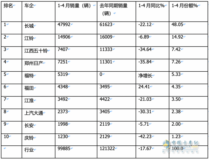 上圖表可見,從2024年1-4月國內(nèi)皮卡生產(chǎn)企業(yè)的累計(jì)銷量排名來看: