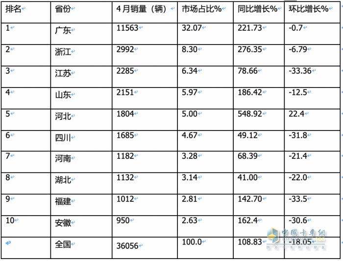 總之,今年4月新能源物流車同比翻倍增長,環(huán)比下降,“成色不足”!遠(yuǎn)程奪冠!從城市流向看,深圳第一;從省份區(qū)域市場看,廣東霸榜!