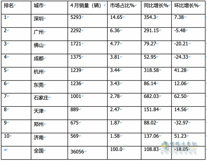 上表可見,在2024年4月新能源城配物流車流向的前10個城市中: