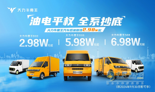 近日,大力牛魔王汽車宣布啟動(dòng)“亮價(jià)風(fēng)暴”活動(dòng),提出油電平權(quán),發(fā)布全系車型抄底價(jià),旨在讓新能源物流車價(jià)格體系回歸透明,回歸車輛的真實(shí)價(jià)值。其中,大力牛魔王D02車型2.98萬起,D05車型5.98萬起,D08車型6.98萬起,活動(dòng)限時(shí)至9月30日。