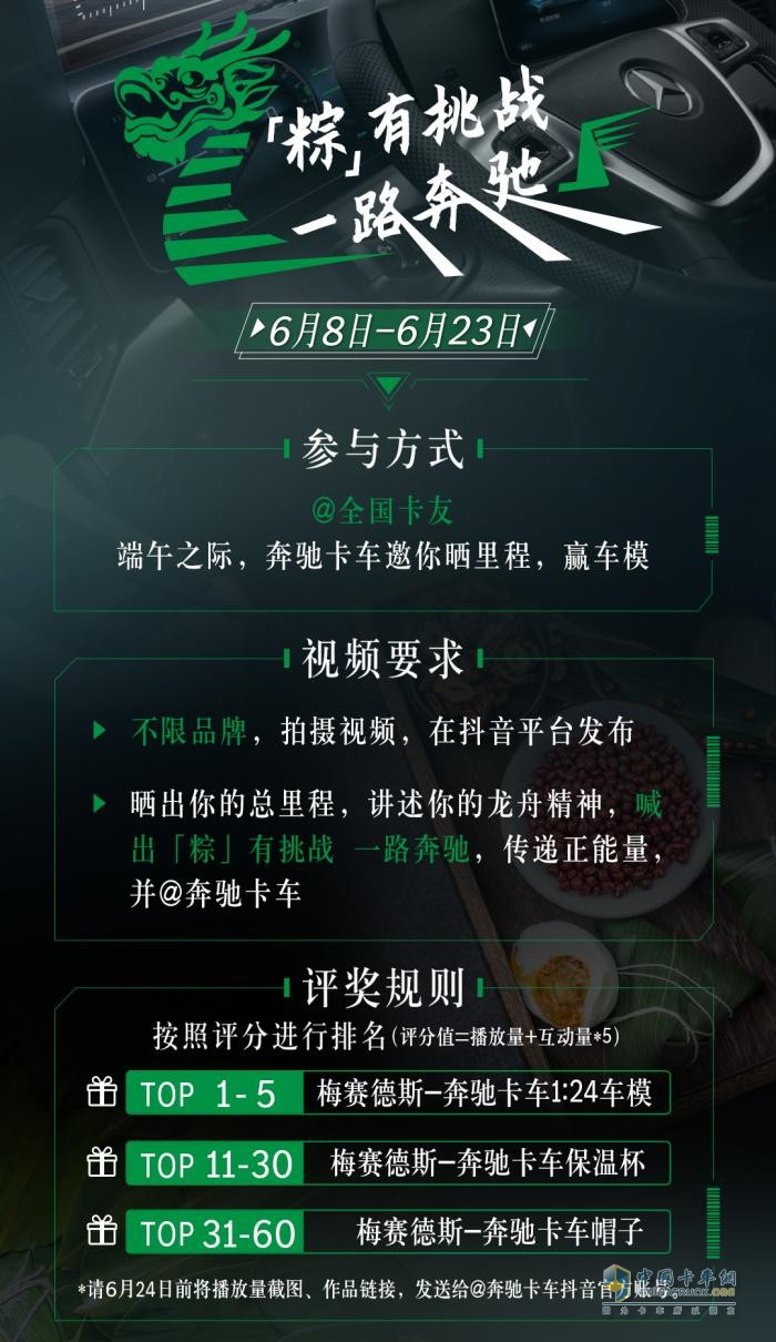 近日,梅賽德斯-奔馳卡車于6月8日-6月23日期間推出“「粽」有挑戰(zhàn) 一路奔馳”曬里程、贏車模有獎(jiǎng)活動(dòng),誠(chéng)邀全國(guó)卡友通過(guò)拍攝視頻講述龍舟精神,傳遞卡車人的正能量。如欲了解詳情,請(qǐng)觀閱下方活動(dòng)規(guī)則。