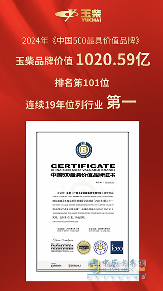 2024年6月19日,第21屆世界品牌大會在北京舉行。會上發(fā)布了2024年《中國500最具價(jià)值品牌》分析報(bào)告和排行榜,玉柴品牌價(jià)值評估為1020.59億元,首次突破千億元,位居榜單第101位,連續(xù)19年領(lǐng)跑內(nèi)燃機(jī)行業(yè)。
