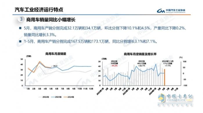 數(shù)據(jù)顯示,5月,我國(guó)商用車產(chǎn)銷分別完成32.1萬輛和34.1萬輛,環(huán)比分別下降10.1%和4.5%,市場(chǎng)步入“盤整期”。商用車市場(chǎng)1-5月產(chǎn)銷分別實(shí)現(xiàn)167.5萬輛和173.1萬輛,同比分別增長(zhǎng)3.1%和7.1%。對(duì)于市場(chǎng)“環(huán)比下降,同比上升”的小幅震蕩,中汽協(xié)表示,5月,我國(guó)經(jīng)濟(jì)總體產(chǎn)出繼續(xù)擴(kuò)張,企業(yè)生產(chǎn)經(jīng)營(yíng)活動(dòng)保持恢復(fù)發(fā)展態(tài)勢(shì)。