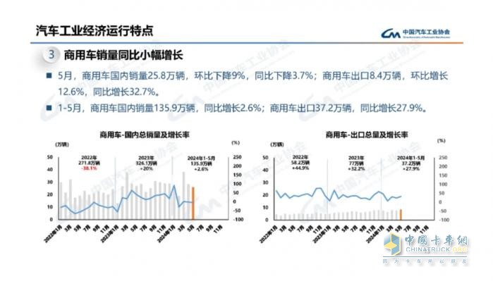 5月,商用車國(guó)內(nèi)銷量25.8萬輛,國(guó)內(nèi)市場(chǎng)環(huán)比、同比均呈下降趨勢(shì);與之形成鮮明對(duì)比的是,商用車出口達(dá)8.4萬輛,環(huán)比增長(zhǎng)12.6%,同比增長(zhǎng)32.7%。今年1-5月,商用車國(guó)內(nèi)銷量135.9萬輛,同比增長(zhǎng)2.6%;商用車出口37.2萬輛,同比增長(zhǎng)27.9%。汽車出口延續(xù)快速增長(zhǎng)態(tài)勢(shì),中國(guó)品牌繼續(xù)保持良好表現(xiàn)。
