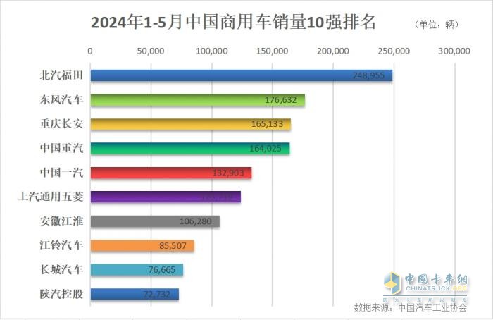 銷量靠前的企業(yè)中,北汽福田以“輕型車”見長(zhǎng),今年1-5月,福田銷量總計(jì)248,955輛,銷量一路領(lǐng)跑,市場(chǎng)份額穩(wěn)居行業(yè)首位。東風(fēng)汽車前5個(gè)月的市場(chǎng)銷量為176,632輛,行業(yè)排名第二,其中重卡和輕卡產(chǎn)品格局則比較“均衡”。重慶長(zhǎng)安銷量165,133輛,晉級(jí)行業(yè)前三。中國(guó)重汽與一汽解放兩家都是以“中重型”商用車為核心的企業(yè),爭(zhēng)相分割中重卡市場(chǎng)“蛋糕”。重汽1-5月銷量達(dá)164,025輛,位居行業(yè)第四位;解放累計(jì)銷量為132,903輛,排名行業(yè)第五。