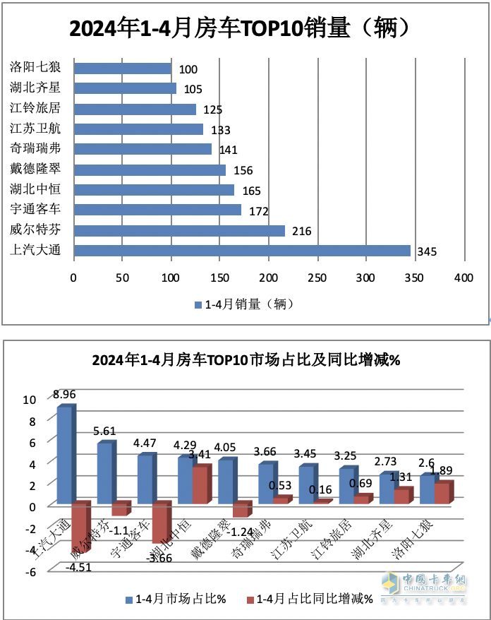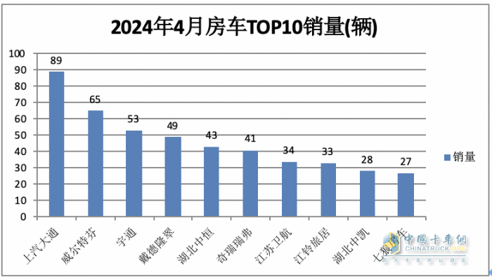 上圖表顯示,在2024年1-4月房車?yán)塾嬩N量TOP10中: