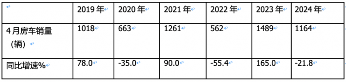 表1,根據(jù)終端上牌數(shù)據(jù),近6年4月房車銷量及同比統(tǒng)計:![]()