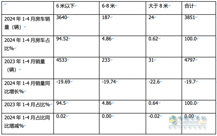 表2,按車型長度段劃分,2024年1-4月及2023年同期房車市場銷量及同比情況統(tǒng)計(數(shù)據(jù)來源:終端上牌信息)![]()