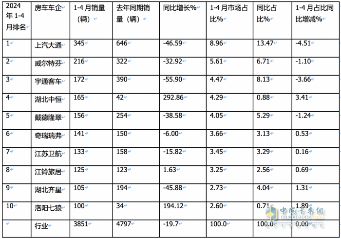 總之,2024年4月及1-4月房車市場均下降,均處于低迷狀態(tài);上汽大通、威爾特芬及宇通客車均均前三。