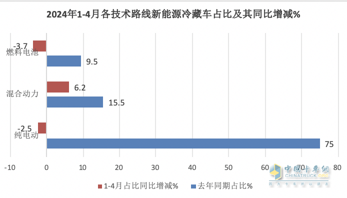 上圖表可見,在2024年1-4一忽兒各類新能源冷藏車銷量同比及占比中: